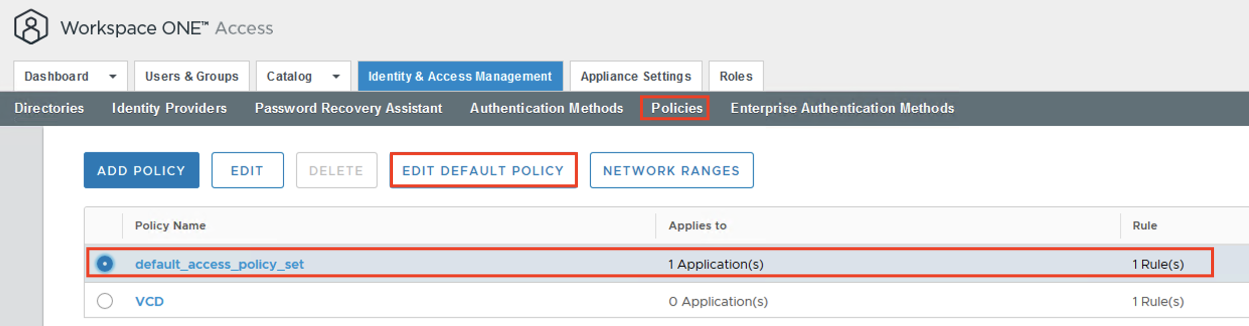 The last configuration step on Workspace One Access (vIDM) is to update the default access policy to include the second factor authentication mechanism. For that, login into Workspace One Access as an admin user and then: