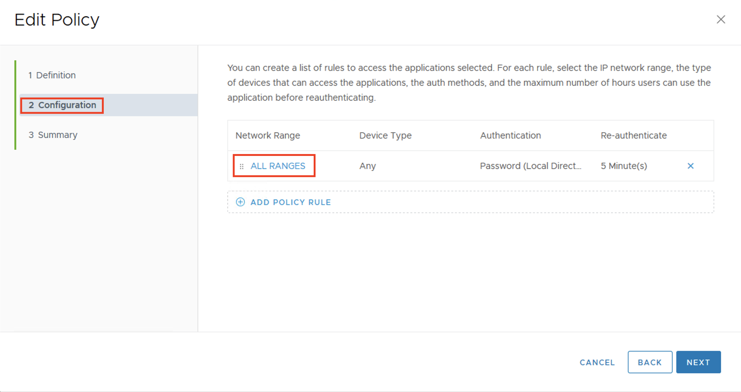- This will open up new page showing the details of the default access policy. Go to “Configuration” and Click on “ALL RANGES”.