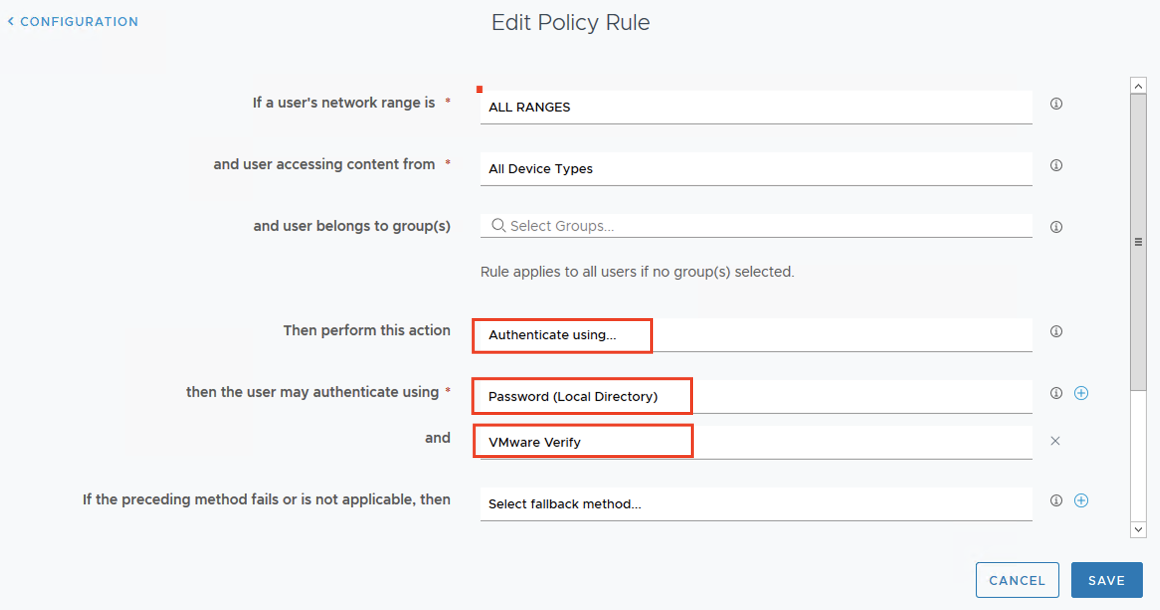 - and Select second authentication mechanism. here I am adding VMware Verify – This will make that after a successful password authentication, users will get a notification on their mobile phones to accept or deny the login request.