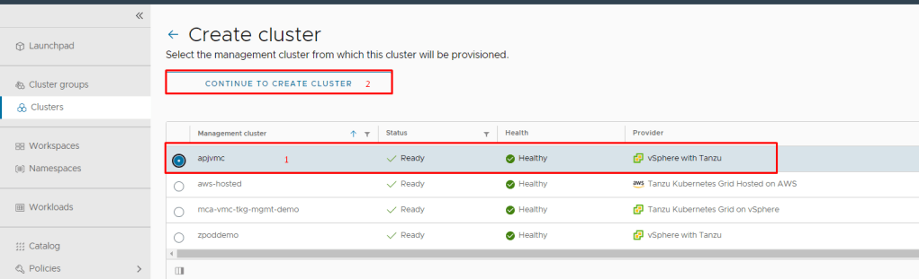 Select your VMC Tanzu Management Cluster and click on “CONTINUE TO CREATE CLUSTER”