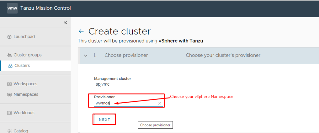 on the next screen choose “Provisioner” (namespace name”). you add a provisioner by creating a vSphere namespace in the Supervisor Cluster, which you can do in VMC vCenter.