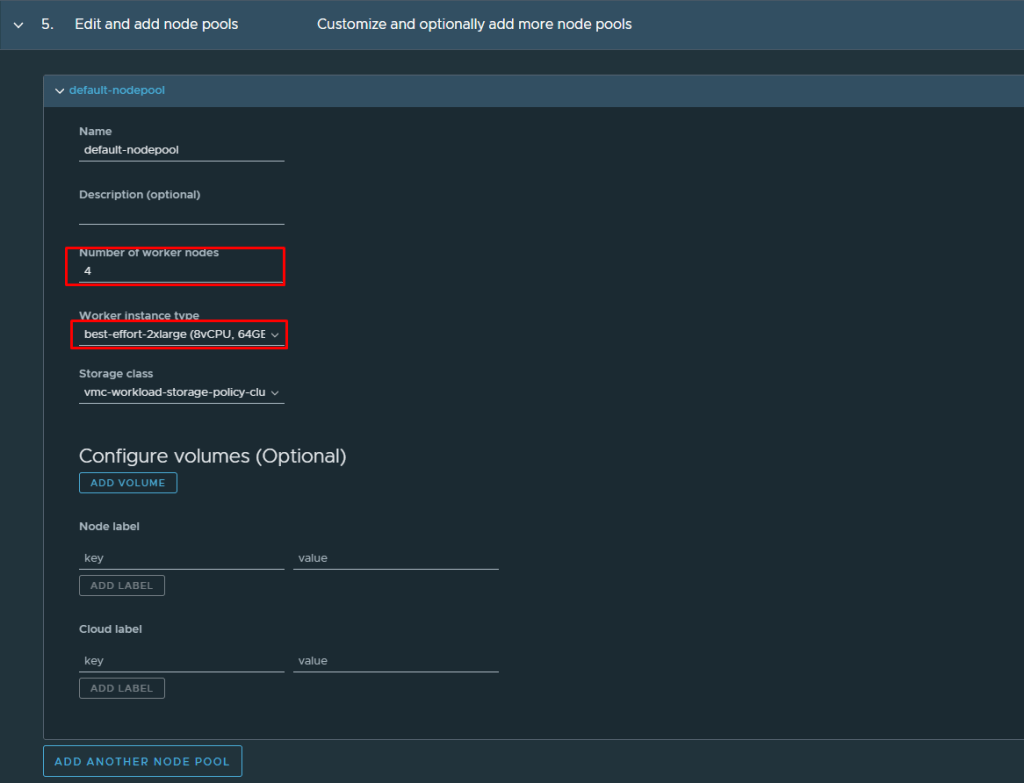 Next is you can define the default node pool and create additional node pools for your cluster. specify the number of worker nodes to provision also select the instance type for workload clusters and select the storage class