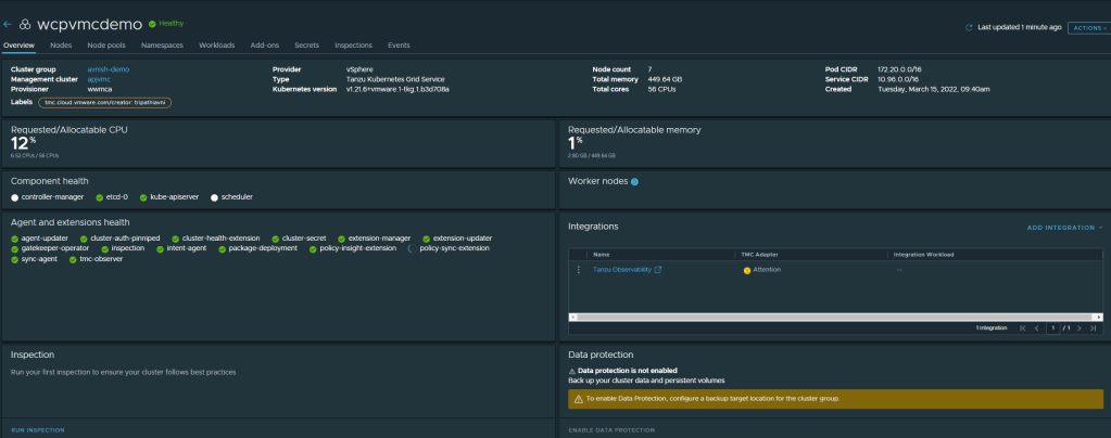 Go to Tanzu Mission Control and validate that VMC supervisor cluster is registered and healthy by going to Tanzu Mission Control, Click on Administration, to go “management cluster” and check the status