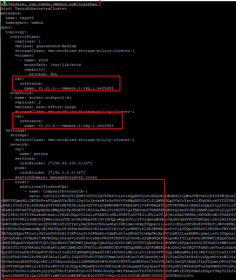 • #tkr.reference.name is the TKR NAME #to be used by control plane nodes; supported format is “v1.21.2—vmware.1-tkg.1.ee25d55”
