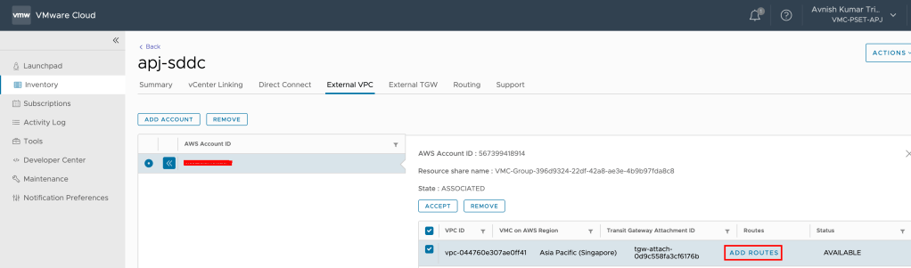 - Navigating back to the SDDC Group, External VPC tab, select the AWS account ID used for creating your FSx NetApp ONTAP, and click Accept. This process takes some time..