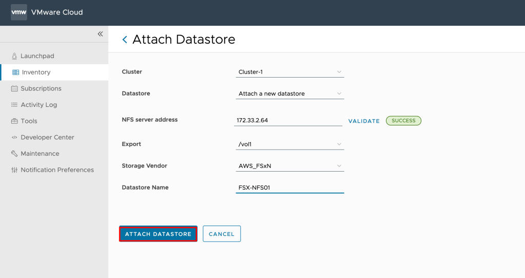 Now it’s time for you to go back to the VMware Cloud on AWS console and open the Storage tab of your SDDC. Click ATTACH DATASTORE and fill in the required values.
