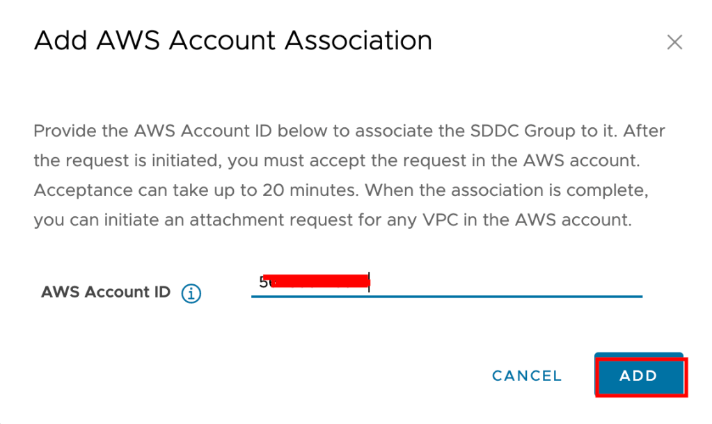After the SDDC Group is created, it shows up in your list of SDDC Groups. Select the SDDC Group, and then go to the External VPC tab and click on ADD ACCOUNT button, then provide the AWS account that will be used to provision the FSx file system, and then click Add.
