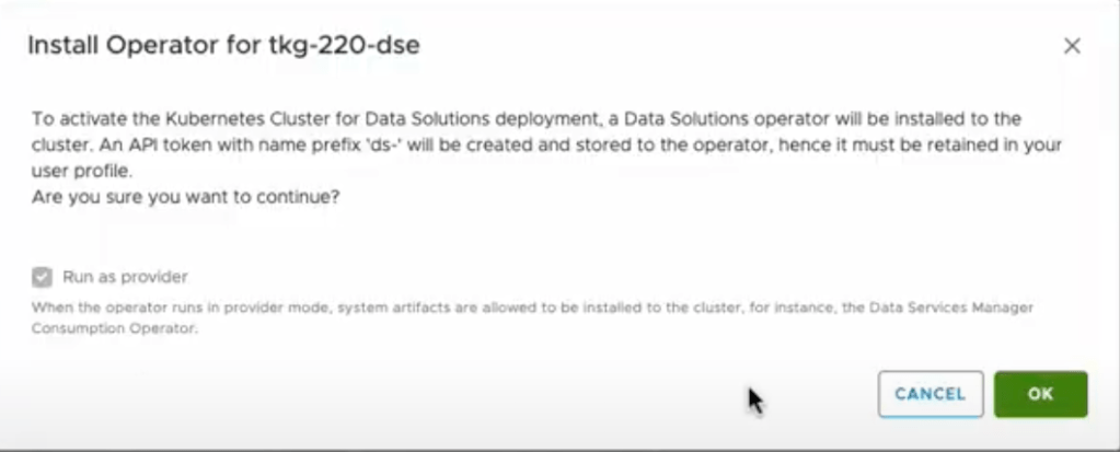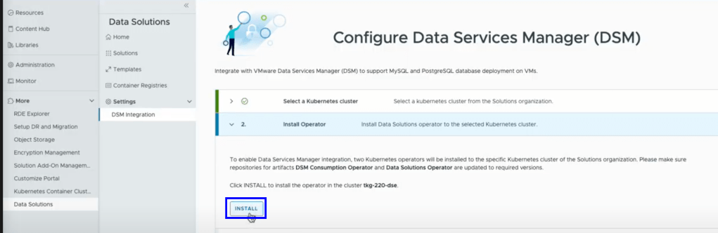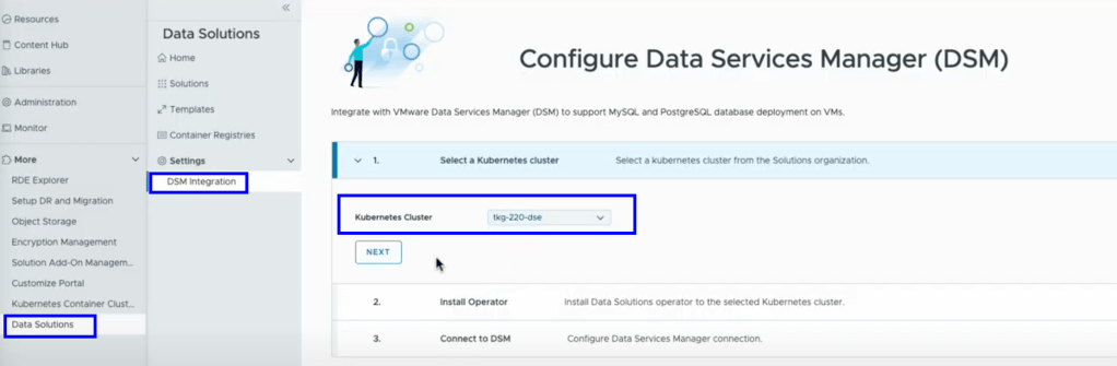 Settings > DSM Integrationwithin the Data Solutions Extension interface - Choose the TKG cluster (this is provider hosted K8s Cluster) where you want to deploy the data services operatorr and click Next.