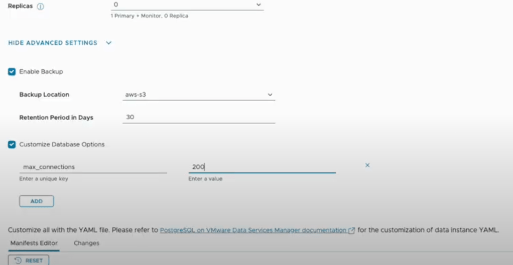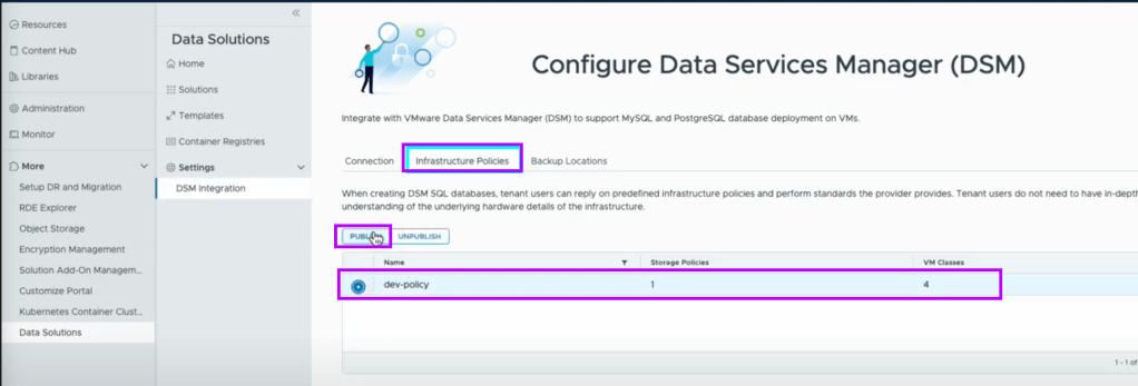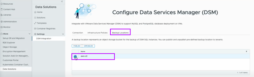 For more details on how to setup DSM see – set up the infrastructure policy and backup locations in the VMware Data Services Manager portal, see the VMware Data Services Manager Documentation.