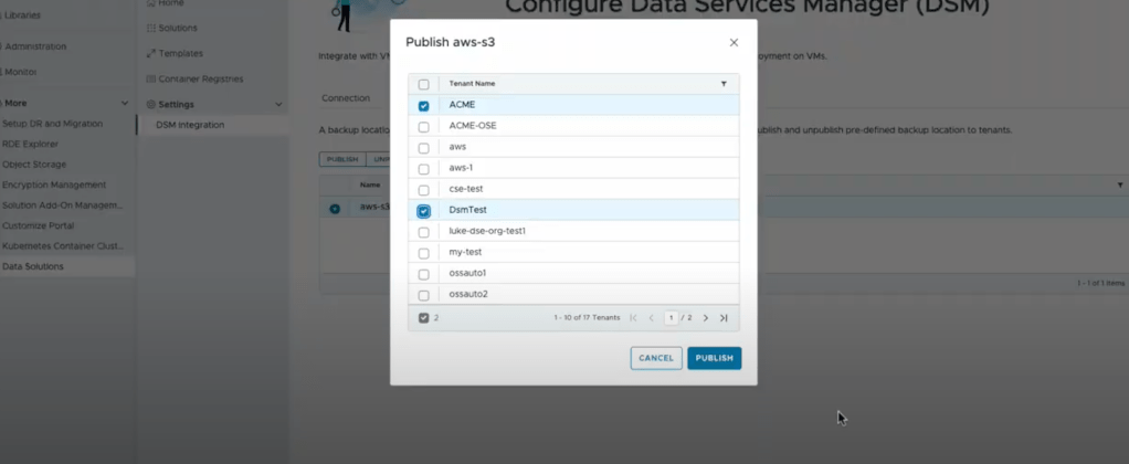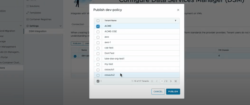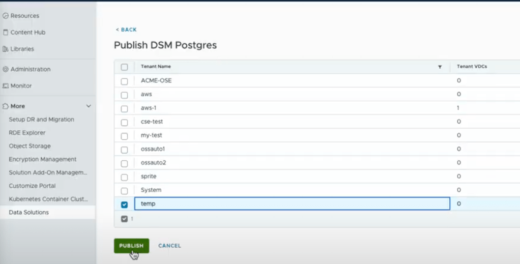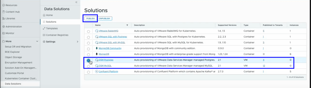 Once the integration is complete, you can publish VMware DSM PostgreSQL and MySQL solutions to tenant organizations.