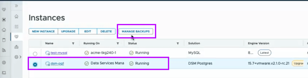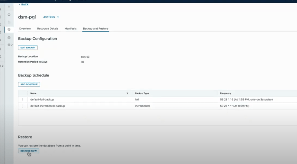 You can backup solution instances on-demand or by using a custom backup schedule. You can back up and restore VMware SQL with Postgres, VMware SQL with MySQL, VMware Data Services Manager MySQL, and VMware Data Services Manager Postgres instances.