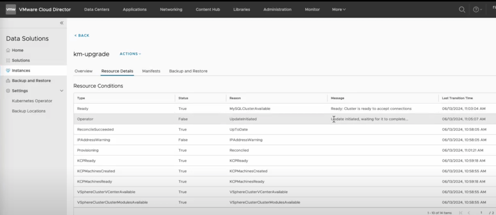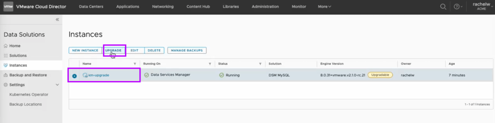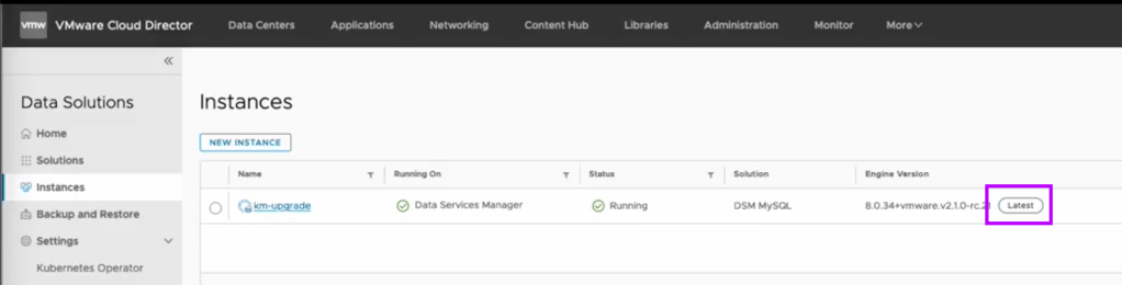You can upgrade the available data solutions and their instances within the VMware Cloud Director extension for Data Solutions.