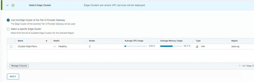 - Assign an Edge Cluster – Pick the Edge cluster where the VPC services for this organization will operate. (You may choose the same cluster associated with the Tier-0 provider gateway, or a different Edge cluster depending on your resource planning)