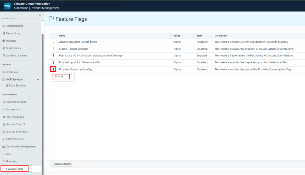 A PCO ( Provider consumption organization ) is created which the provider can use to share blueprint catalog, workflows with other tenant organizations , this must be enabled by going to Administration > Feature flags and enable PCO Organization feature flag