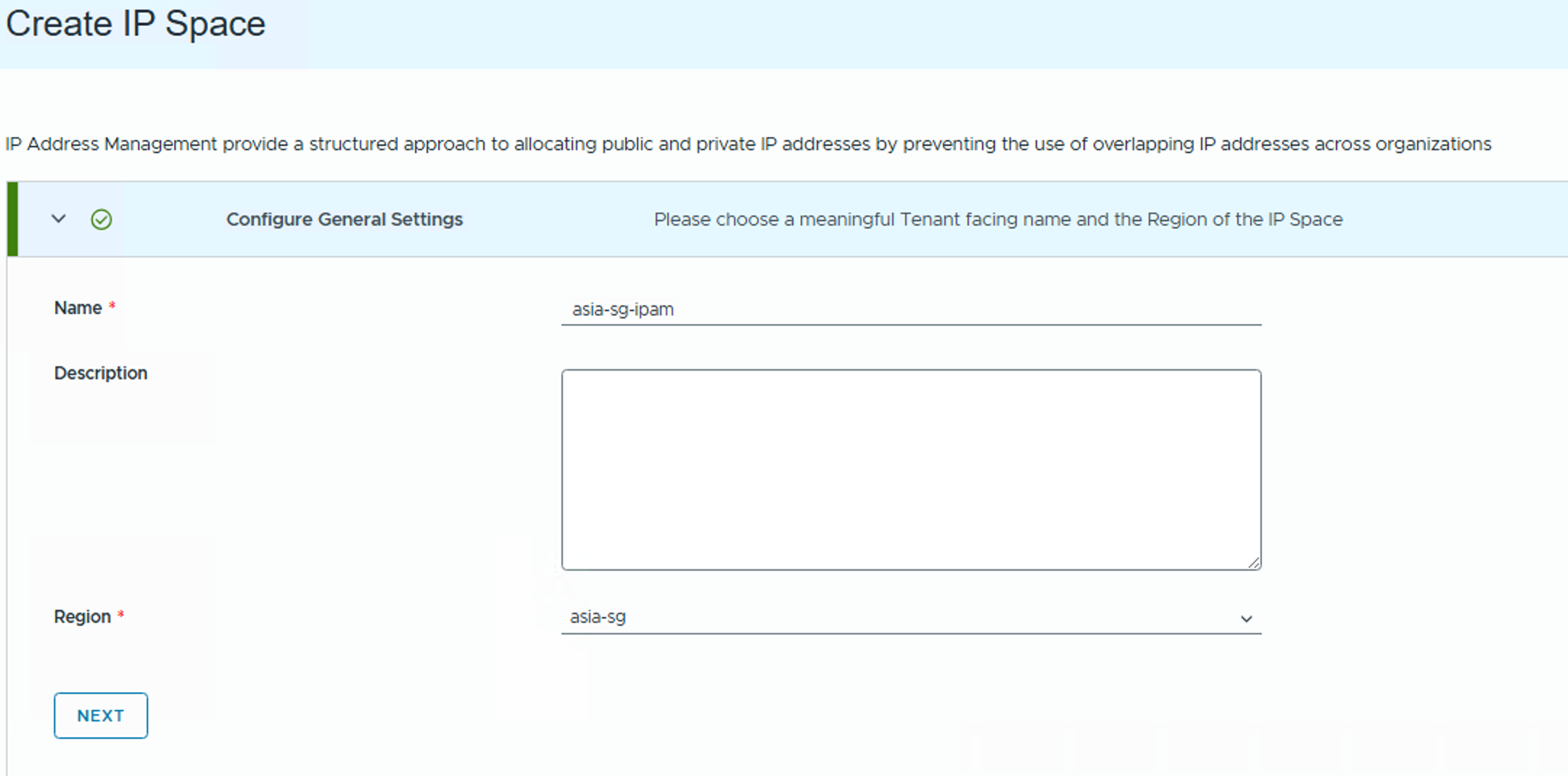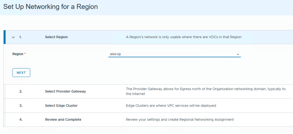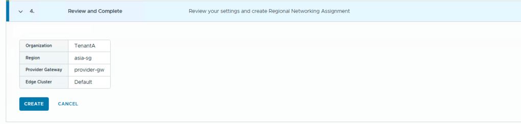 - Review and Confirm – Review all configured network settings. Once validated, click Create to complete the network setup for the organization.Select a region, and click Next