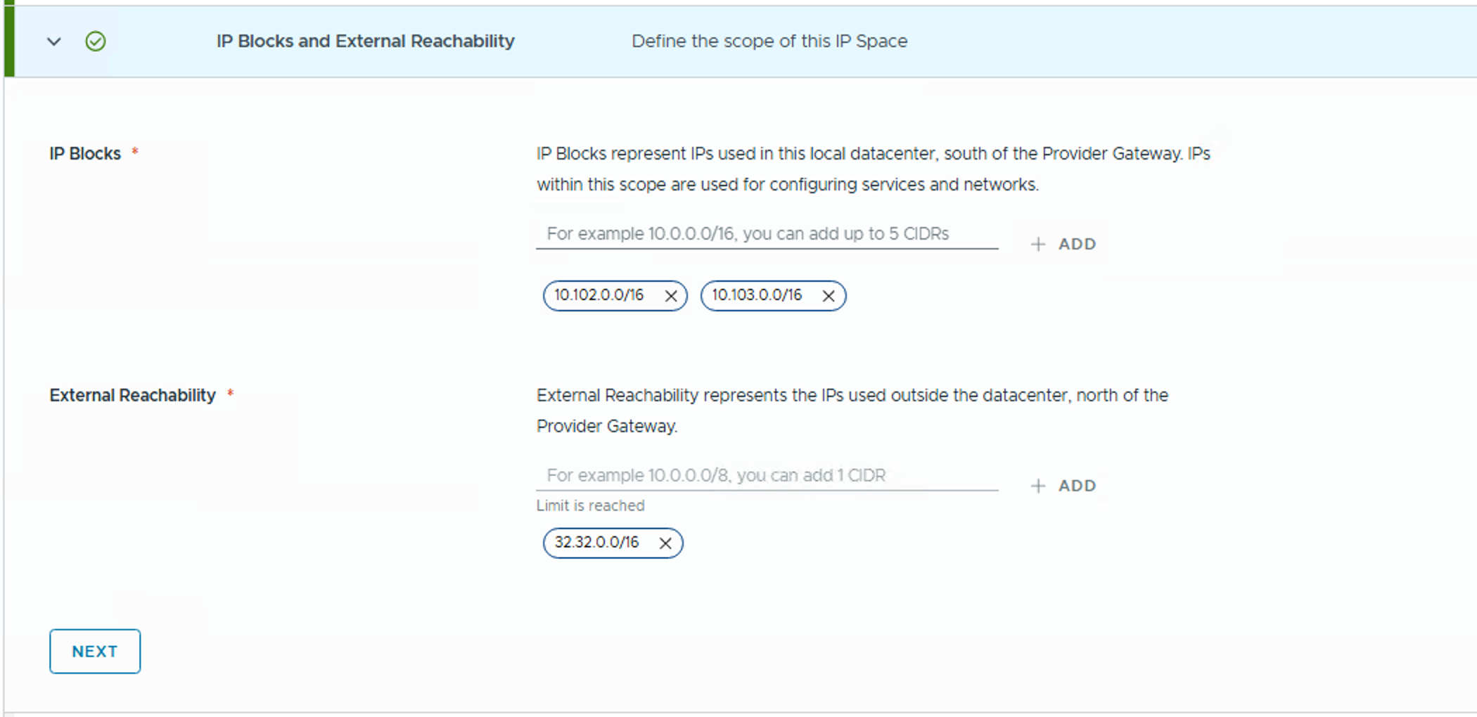 Go to Networking > IP spaces to create a new IP Space and set quotas. IP Blocks are created in NSX. IP Blocks represent IPs used in this local datacenter, south of the Provider Gateway. IPs within this scope are used for configuring services and networks.