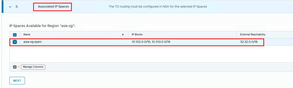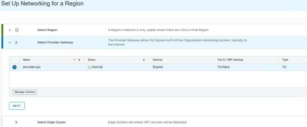 - From the drop-down menu, select the region of the tier-0 gateway, and click Next.