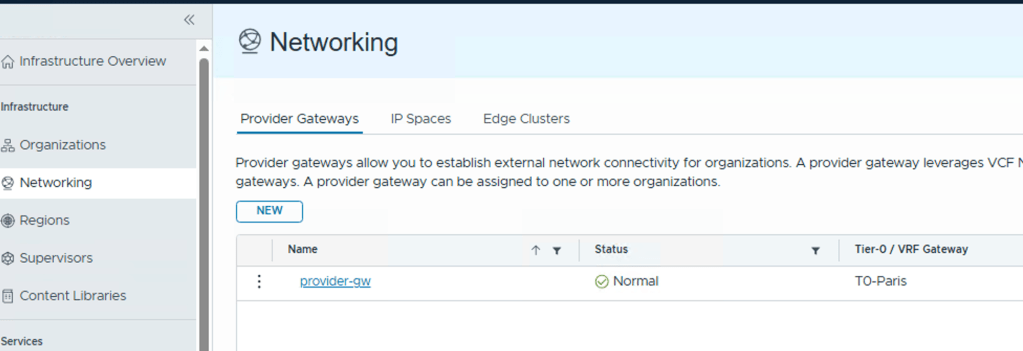 A provider gateway leverages VCF Networking T0s or T0 VRFs, and associates them with IP addresses from IP spaces that can be advertised from those gateways. A provider gateway can be assigned to one or more organizations.